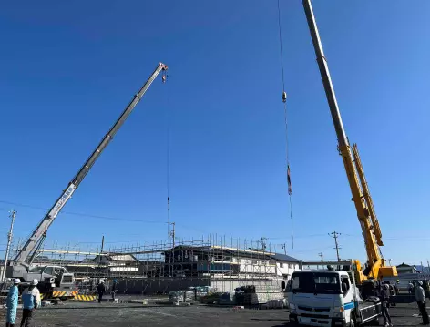 依頼した鳶さんと事前打ち合わせを元に、現場の指示に合わせて安全第一に鉄骨を建てていきます。